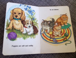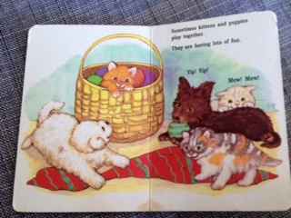 The book finishes up with an idyllic scene where four kittens are playing with one puppy. This is Baby 1.0’s favorite page because this is where I get to say “Yip! Yip! Mew! Mew!” which she thinks is the best thing in the whole world, which in turn makes me think this book is the best book in the whole world.
