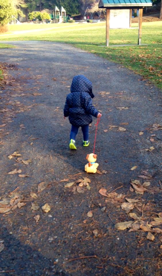 This week we are reviewing a book from the old classic Curious George series, Curious George and the Puppies. While I’m not sure about the popularity of this specific book, I can say it’s pretty popular in our house because it has pictures of dogs, which Baby 1.0 is currently absolutely obsessed with. Case and point, the following picture of Baby 1.0 walking her plastic dog at the park yesterday.